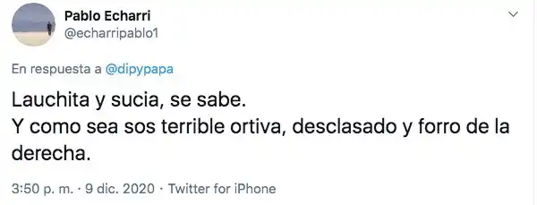 La contundente respuesta de Echarri llegó, cuándo no, en Twitter, donde se dirimen las rencillas y las diferencias hoy día. "Lauchita y sucia, se sabe. Y como sea sos terrible ortiva, desclasado y forro de la derecha". No puso más nada. No hacía falta para comprender lo mal que le cae El Dipy.