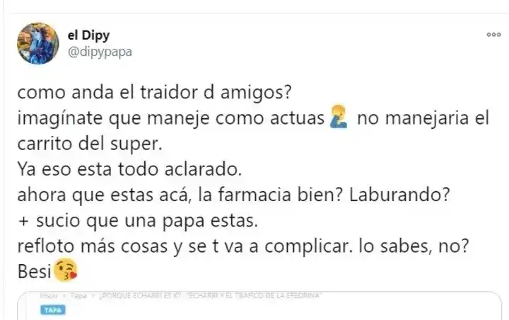 "¿Cómo anda el traidor de amigos?", comenzó preguntando El Dipy. Y siguió: "Imaginate que maneje como actuás, no manejaría el carrito del super".