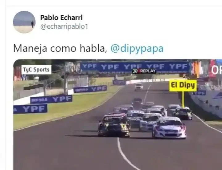 "Maneja como habla El Dipy", expresó Echarri en Twitter, picante, acompañando su frase con un video del choque. Fue su manera de desmerecer los argumentos que sostiene el cantante cada vez que se trenzan en alguna discusión sobre política o actualidad.