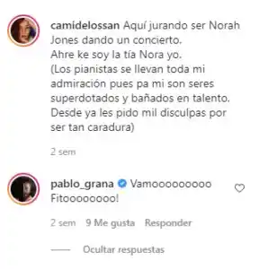 Luego, en un video que subió la joven cantando una canción de Norah Jones, Pablo hace un comentario con humor y amor: "Vamos fitoooo", escribió.