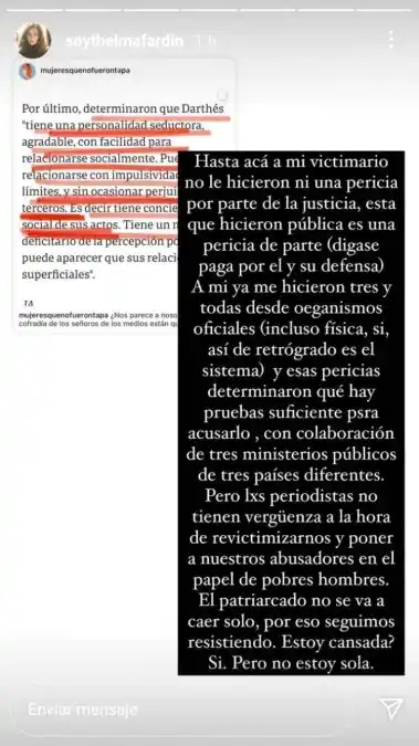 Thelma lamentó que existan periodistas que "ponen" a los abusadores "en el papel de pobres hombres". Y concluyó: "El patriarcado no se va a caer solo, por eso seguimos resistiendo. ¿Estoy cansada? Sí. Pero no estoy sola".