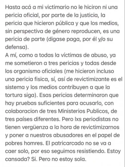 "A mí ya me sometieron a tres pericias, y todas desde los organismos oficiales -precisó-. Me hicieron incluso una pericia física; sí, así de revictimizante es el sistema y los medios contribuyen a que la tortura siga. Esas pericias determinaron que hay pruebas suficientes para acusarlo, con colaboración de tres ministerios públicos, de tres países diferentes (Argentina, Nicaragua y Brasil)".