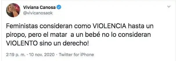 "Feministas consideran como VIOLENCIA hasta un piropo, pero el matar a un bebé no lo conideran VIOLENTO sino un derecho" escribió en su cuenta de Twitter, donde recibió un sinfín de comentarios apoyando su postura. Obviamente, hubo otros que la criticaron y le pidieron que la reviera. Hace unos años, en una marcha antiaborto, Canosa participó de una especie de "acting" en donde se simulaban una ecografía y un parto "en vivo y en directo".