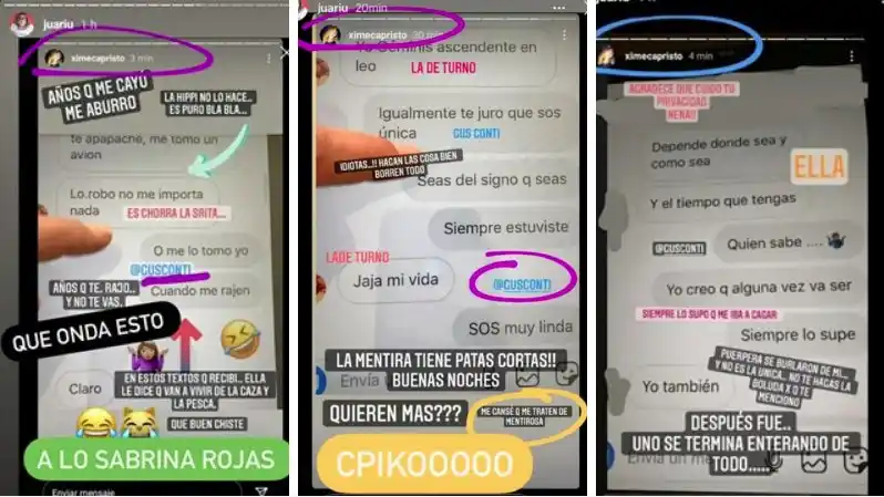 "Hace años que me callo, y me cansé" escribió Capristo en el más elocuente de sus mensajes. "Me aburro" escribió también. Curiosamente, les dio una especie de consejo al decirles "idiotas, hagan las cosas bien y borren todo". En un momento, Conti le dice a la enigmática muchacha en cuestión que se van a encontrar cuando puedan o cuando Ximena lo eche de su casa. "Hace años que te rajo y no te vas", escribió la mediática.