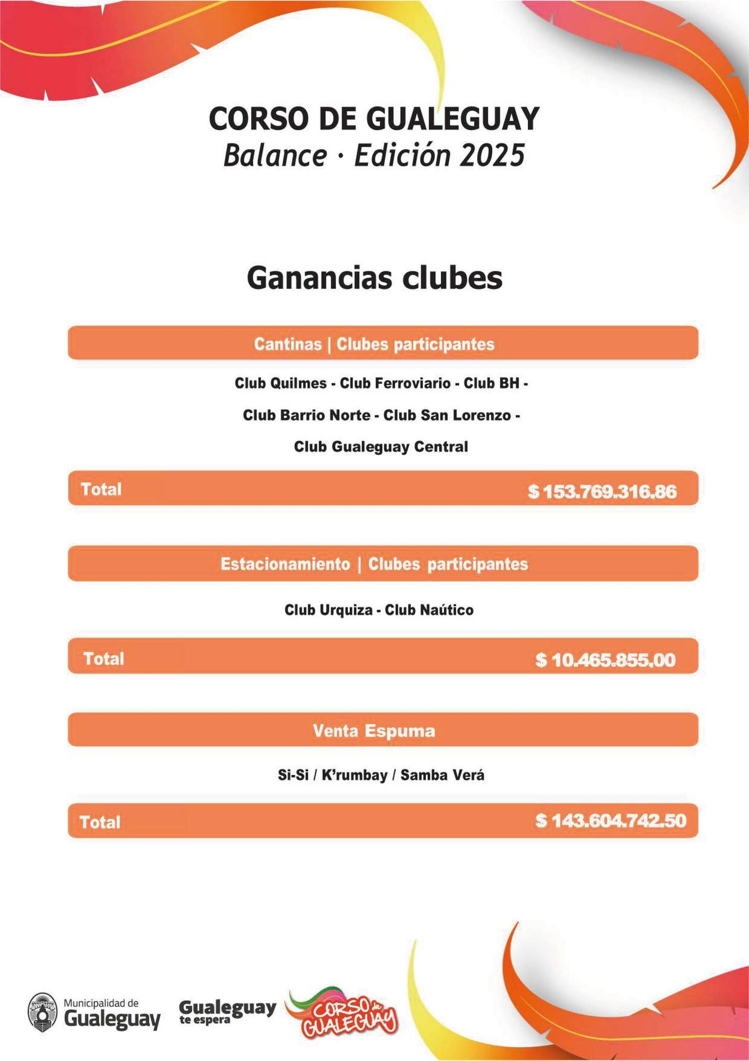 Las seis cantinas que operaron durante el evento —tres acompañando a las comparsas y tres de manera independiente— generaron un total de $153.769.316,86. Además, los clubes que gestionaron los estacionamientos recaudaron $10.465.855, fondos que, según se informó, se destinarán a mejoras en infraestructura.