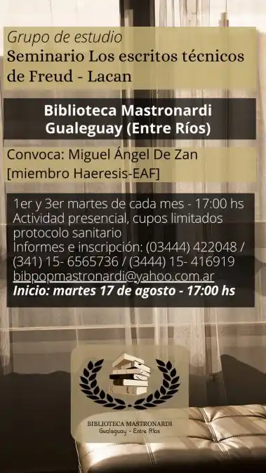 En la Biblioteca Mastronardi, se iniciará el martes 17 de agosto a las 17:00hs. el "Grupo de Estudio, Seminario los Escritos técnicos de Freud [J. Lacan]"