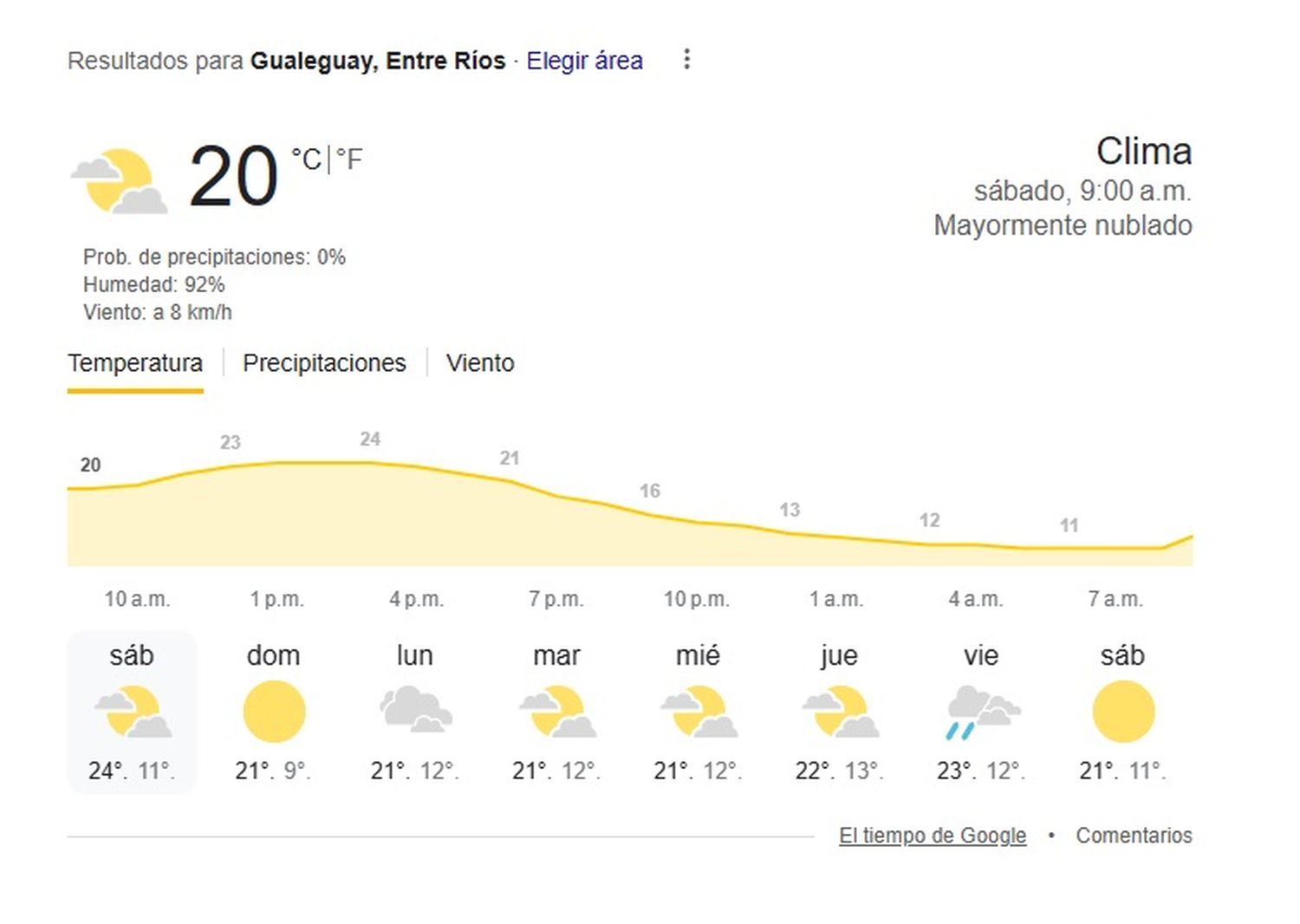 La temperatura máxima prevista para hoy sábado es de 24°C, con una mínima de 11°C. La humedad se mantiene alta, con un 92%, aunque esto no parece afectar la sensación térmica. Los vientos soplan levemente a 8 km/h, contribuyendo a un ambiente templado.