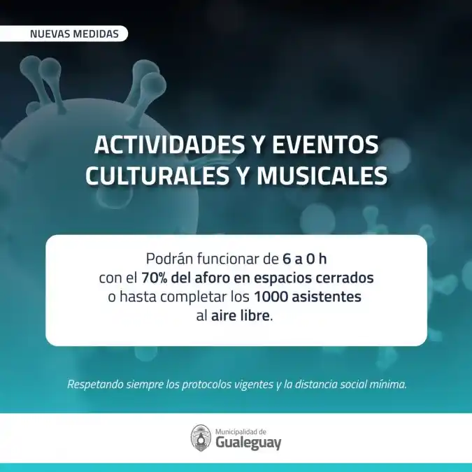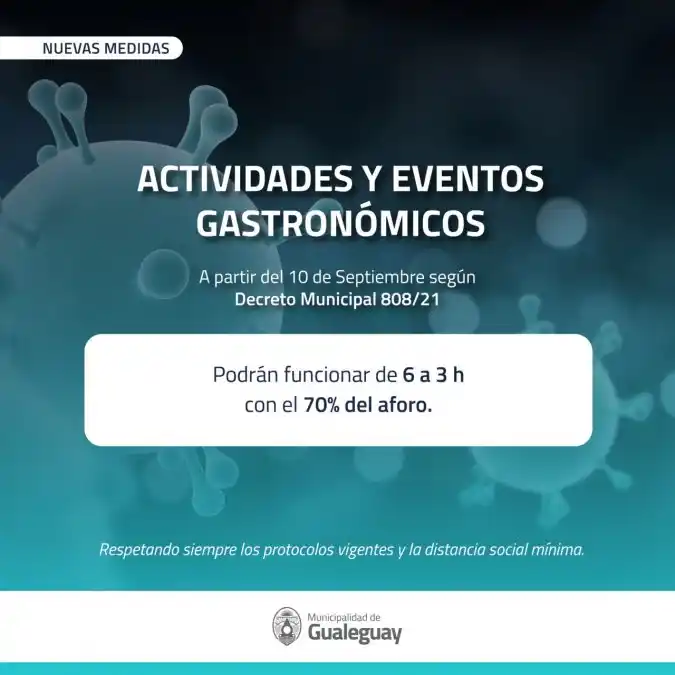 A través del Decreto Municipal Nro. 808/21 de fecha 10 de septiembre Gualeguay se adhirió a las medidas impuestas por la Provincia.