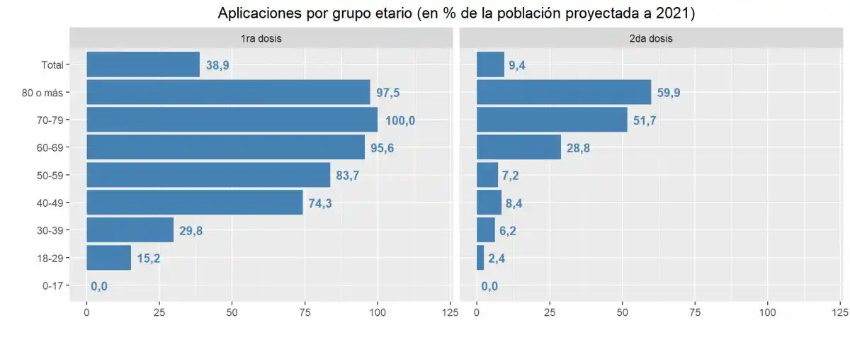 Otro dato alentador es que en los grupos de entre 50 am 59 años, el 83,7 por ciento cuenta ya con una dosis; mientras que en el grupo de 40 a 49 años un 74,3 % cuenta con la primera aplicación.