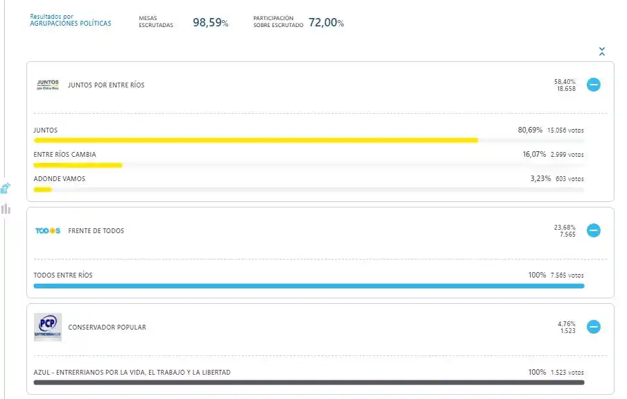En base a los datos oficiales, con el 98,59 % de las mesas escrutadas en Gualeguay, la lista que lleva a la candidata local se impuso holgadamente sobre la del Frente de Todos, que encabeza el titular del Ente Nacional de Obras Hídricas de Saneamiento (Enohsa), Enrique Cresto, seguido por la actual diputada Carolina Gaillard; y el coordinador de Asuntos Municipales Región Centro de la Nación, Tomás Ledesma.
