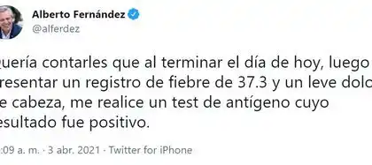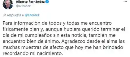 "Para información de todos y todas me encuentro físicamente bien y, aunque hubiera querido terminar el día de mi cumpleaños sin esta noticia, también me encuentro bien de ánimo", dijo Fernández. Y agregó: "Agradezco desde el alma las muchas muestras de afecto que hoy me han brindado recordando mi nacimiento".