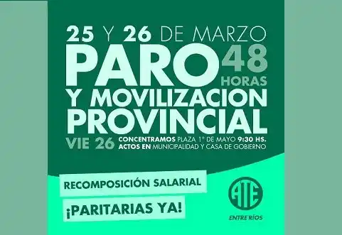 "Ante la falta de una nueva propuesta el 25 y 26 de marzo vamos a un paro de 48 horas", se informó y además se anunció que "el paro del 26 se acompaña de una movilización provincial". Para ello convocan a concentrar a partir de las 9:30 en la Plaza 1° de Mayo.