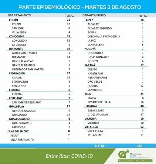 En virtud de los datos reportados por el área de Vigilancia Epidemiológica del Ministerio de Salud este martes 3 de agosto, en Entre Ríos se han sumado 266 casos de Coronavirus.