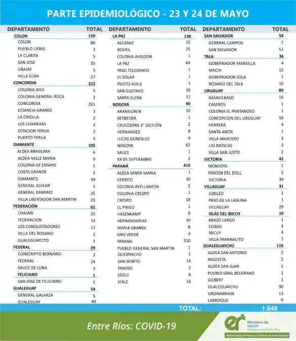 El área de Vigilancias Epidemiológica del Ministerio de Salud, confirmó que en Entre Ríos entre este domingo y lunes se registraron 1649 nuevos casos de coronavirus, distribuidos en 873 el domingo y 776 el lunes.