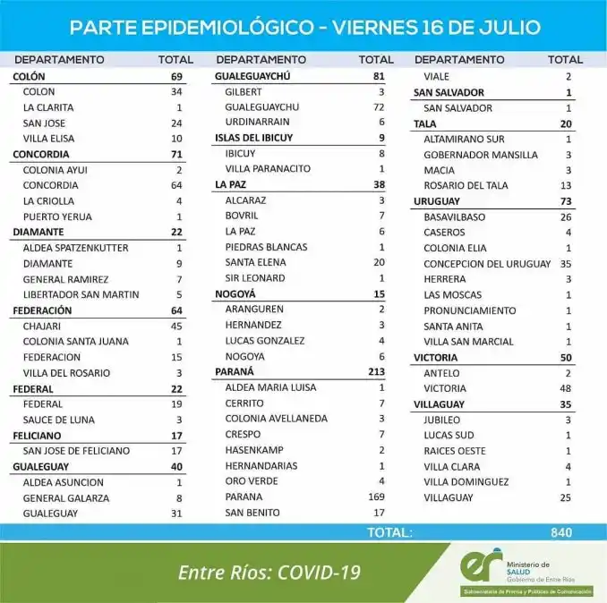 El área de Vigilancia Epidemiológica de Entre Ríos, confirmó que este viernes, se registraron 840 nuevos casos de coronavirus. De ese modo, son 121.832 los positivos confirmados en la provincia. Según el reporte del Ministerio de Salud , los 17 departamentos sumaron positivos este viernes.