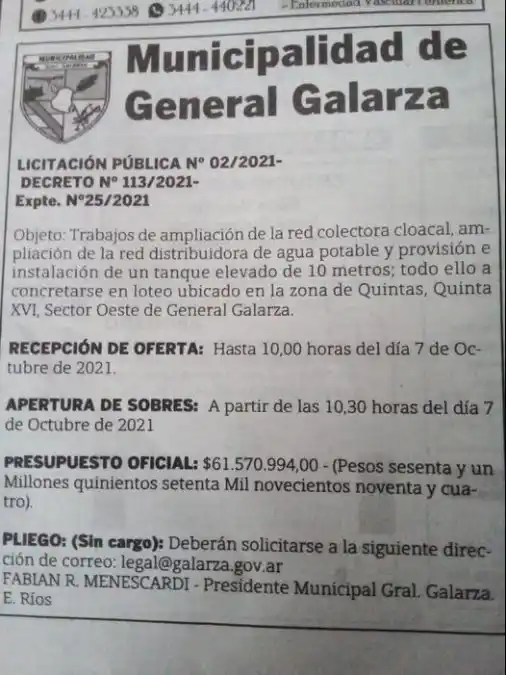 También la Municipalidad de General Galarza realizó el llamado a licitación para la ejecución de las obras hídricas y cloacales que fueron gestionadas ante el Gobierno Nacional a través de Enrique Cresto, titular del Ente Nacional de Obras Hídricas de Saneamiento .