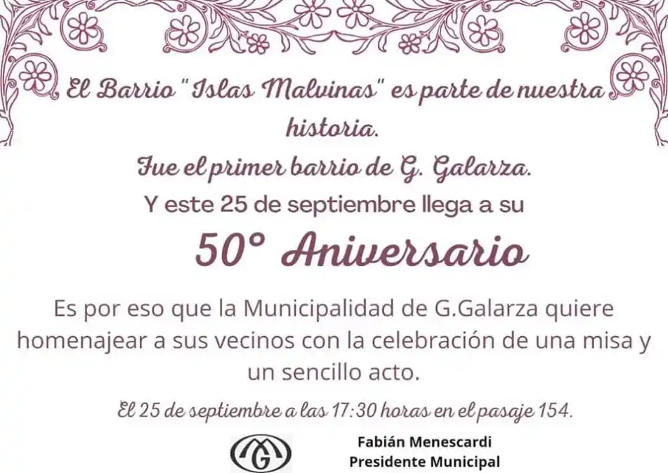 Un hecho destacado en General Galarza será el 50º aniversario del Barrio Islas Malvinas y es por ello que el intendente Fabián Menescardi quiere estar presente