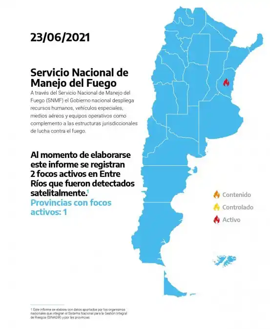 Dos focos de incendios forestales continúan activos en la provincia de Entre Ríos, los cuales fueron detectados de forma satelital, informó esta mañana el Servicio Nacional del Manejo del Fuego (SNMF).