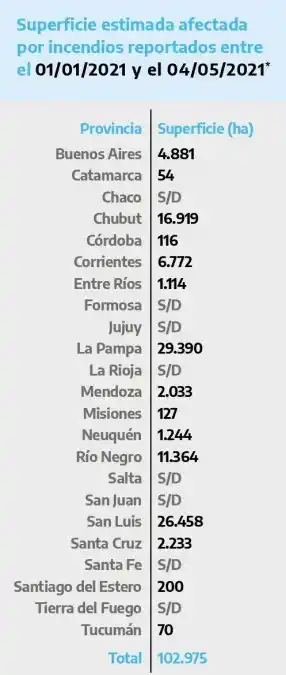 El SNMF precisó que hasta el 4 de mayo pasado hubo 102.975 hectáreas afectadas por incendios, siendo las provincias de La Pampa y San Luis las más dañadas por el fuego con 29.390 y 26.458 hectáreas, respectivamente