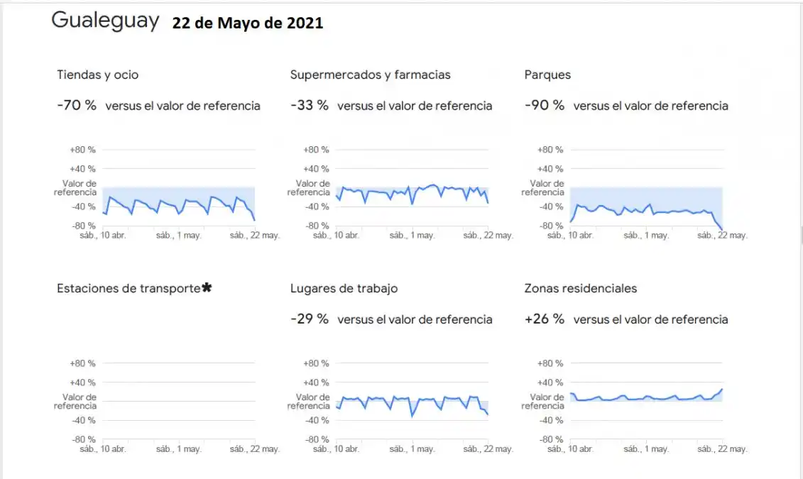 Debido a estas reglamentaciones, en Gualeguay el desplazamiento y permanencia hacia los parques, plazas y costanera disminuyeron en un 90 por ciento. Las Tiendas y lugares que el buscador categoriza como de Ocio sufrieron una baja del 44 %. También disminuyó en mayor medida la concurrencia a farmacias y supermercados, con una merma del 33 %, como así también a lugares de trabajo, que experimentaron una baja del 29 %. La permanencia y traslado a zonas residenciales se incrementó en un 26 por ciento.