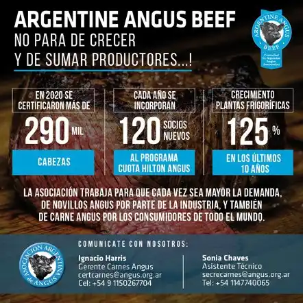 La Asociación Argentina de Angus, a través de su programa Argentine Angus Beef, certificó el año pasado un total de 292.002 cabezas destinadas a la exportación, incluidas las de la cuota Hilton-Angus, el único programa de estas características que existe en el país generado por una organización que nuclea a productores de ganado bovino.