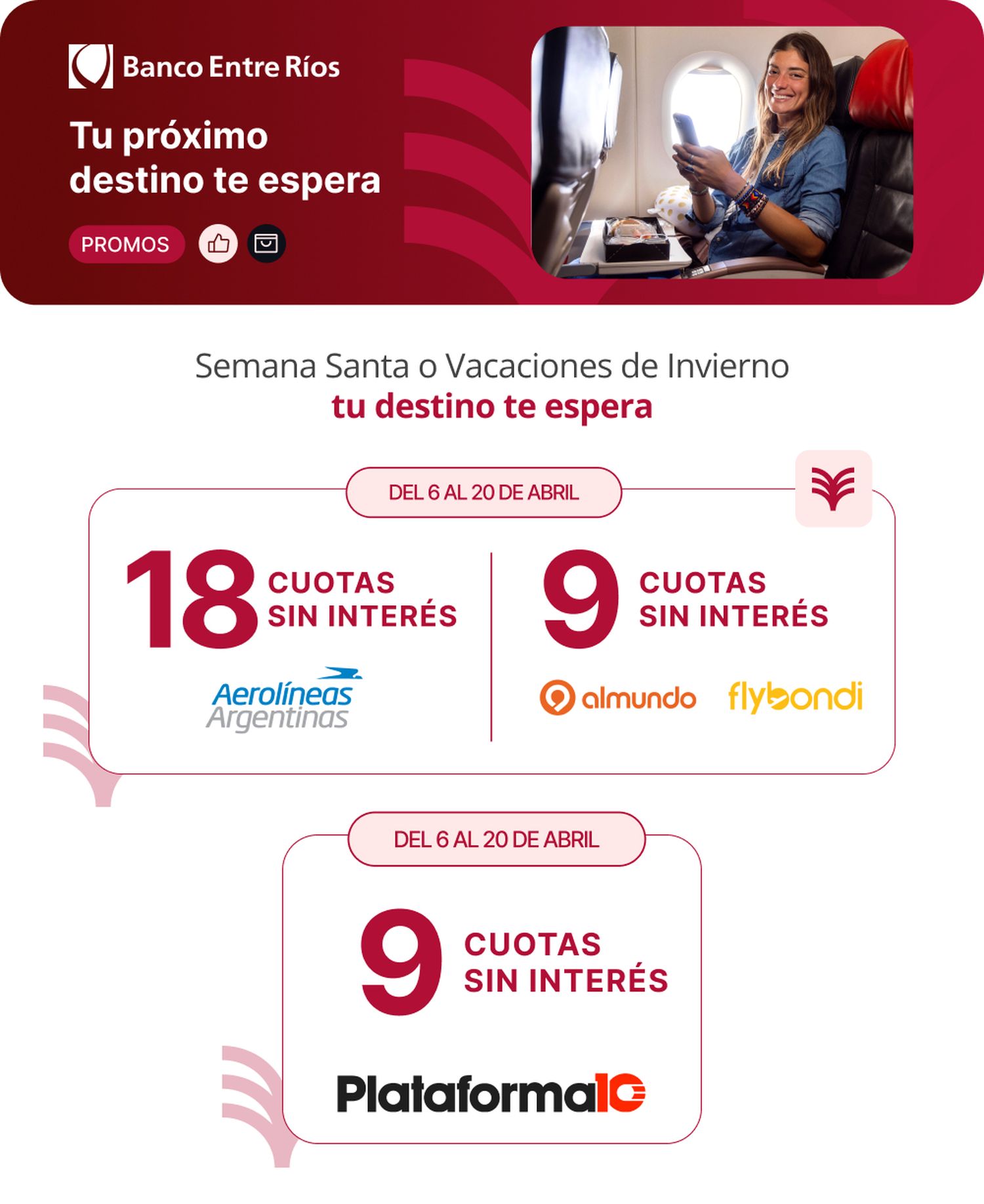 Hasta el domingo 20 de abril, los usuarios de Tarjetas de Crédito de Banco Entre Ríos pueden acceder a hasta 18 cuotas sin interés en Aerolíneas Argentinas y Almundo.com y 9 cuotas sin interés en Flybondi y Plataforma 10, para comprar sus pasajes y paquetes turísticos para destinos nacionales de manera cómoda y conveniente.