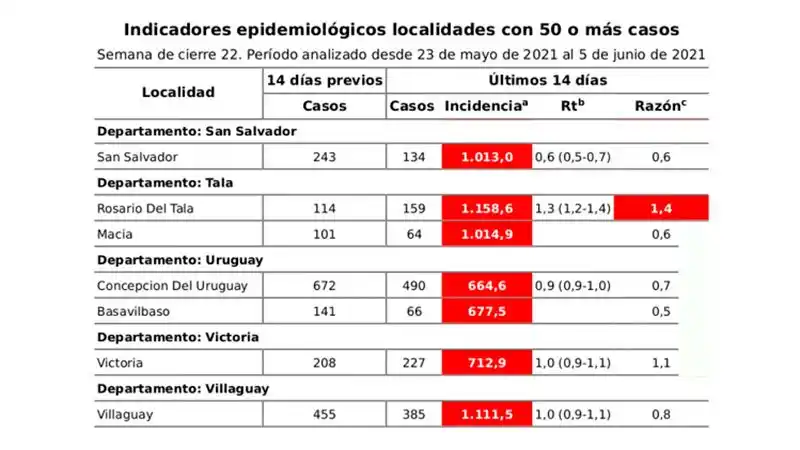 En tanto, las localidades de San Salvador y Villaguay, y el Departamento Uruguay, registran un descenso en el número de casos de Covid-19.