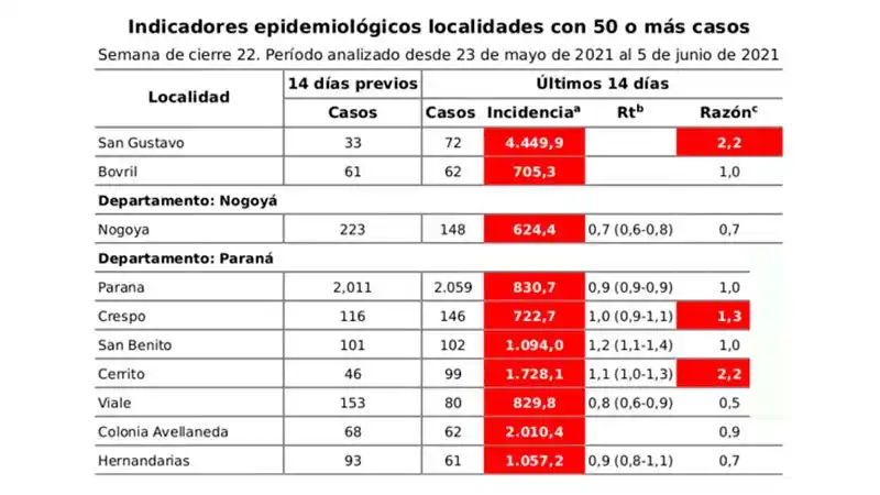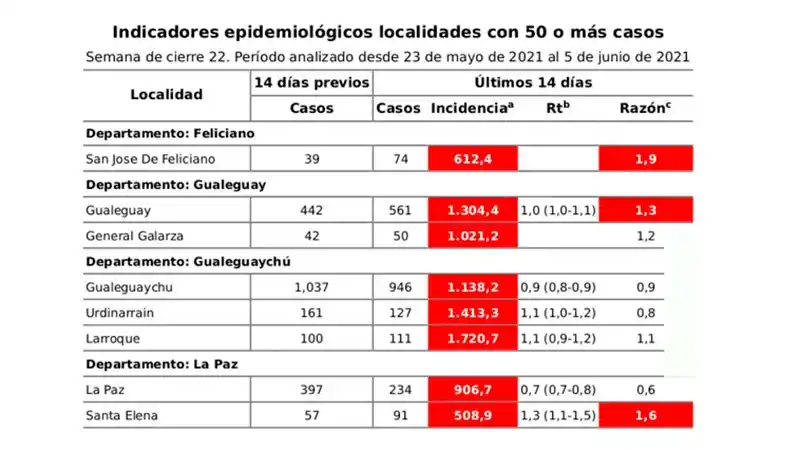 En San José de Feliciano se dio un incremento de casi el doble en la cantidad de casos, mientras que, en Gualeguay, la suba en el número de casos fue de casi un 30%.