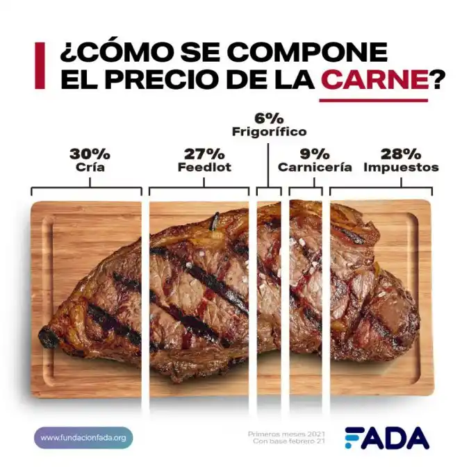 Se registra que la carne tuvo un precio promedio de $531 por kilogramo, de los cuales la cría representa $158 (30%), el feedlot $141 (27%), el frigorífico $35 (6%), la carnicería $47 (9%) y los impuestos $149 (28%). El maíz representa el 15% del precio del novillo y 11% del kilo de carne al mostrador.