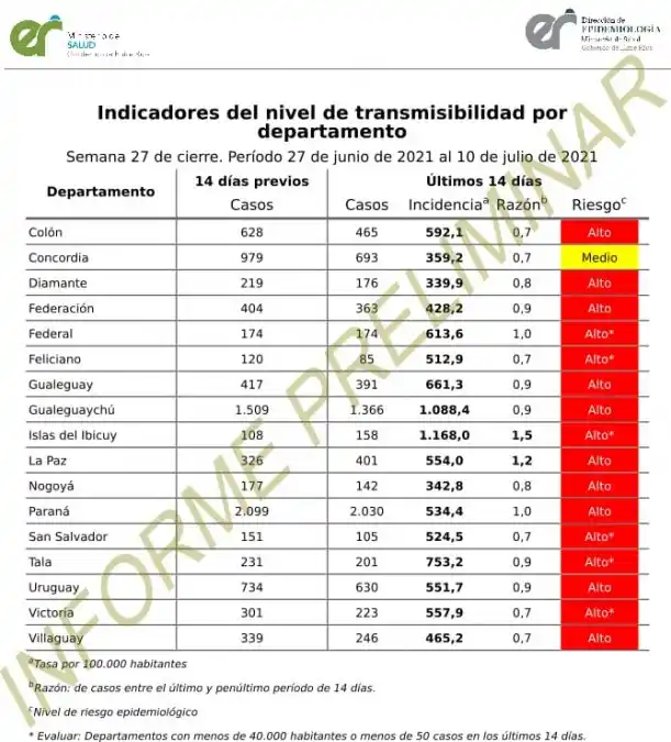 En la actualización que el Ministerio de Salud de la Nación hace sobre la situación de la pandemia por coronavirus en el país, el departamento de Concordia es el único en la provincia de Entre Ríos que está considerado como de riesgo medio.