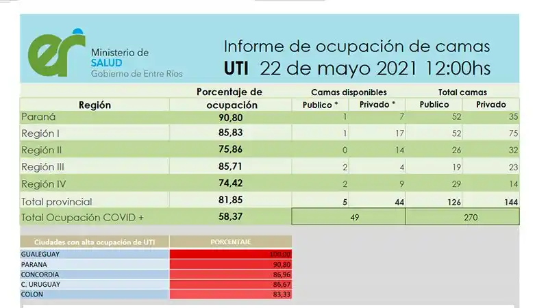 En cuanto a las ciudades, las más comprometidas en ocupación de UTI son Gualeguay (100%); Paraná (90,80%), Concordia está en el 86,96%, Concepción del Uruguay con un 86,67% de ocupación y en Colón, 83,33%.