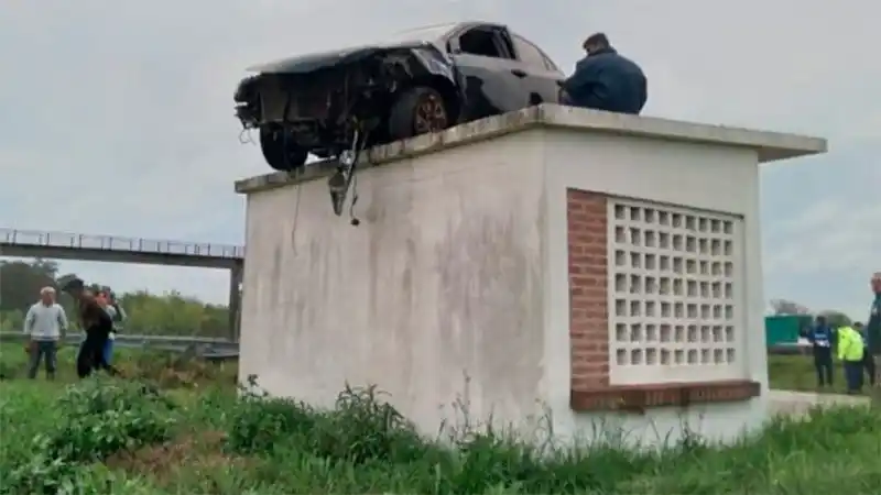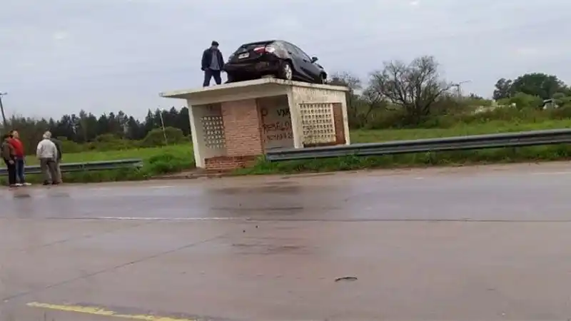 Las características del accidente son impresionantes porque el Toyota, terminó sobre una garita de colectivos a la vera del trazado vial. Según explicaron a este medio, el vehículo despistó producto de la condición húmeda del asfalto por la lluvia, chocó contra el guardarrail y tras volcar, quedó sobre sus ruedas en el techo de una garita de colectivos.